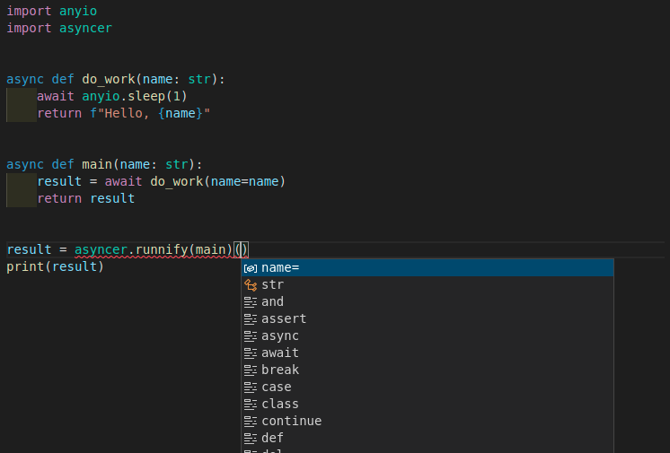 asyncer.runnify() takes the async function you want to call, and then it returns another function that takes the positional and keyword arguments needed, in this case it's just name="World".